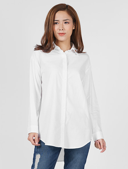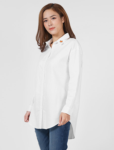 - Áo sơ mi nữ dài tay, cổ đức, thêu hình ở ve cổ áo, phom dáng suông.